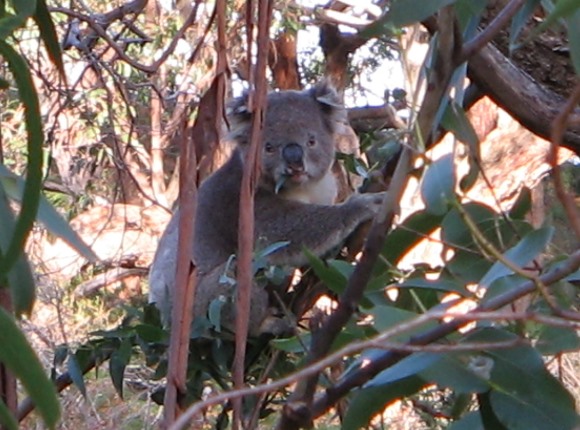 Durch Zufall entdecken wir links neben uns auf einem Baum diesen fressenden Koala, der auch noch schön in