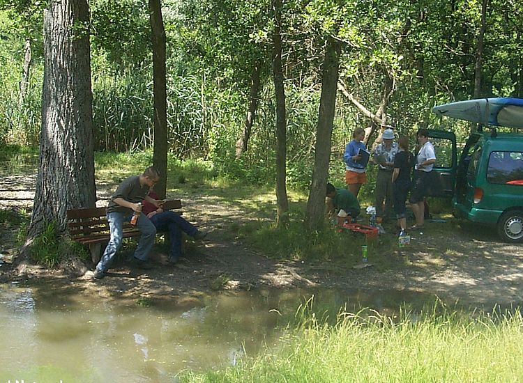 Der schöne Platz für unsere Pause. Auf der Bank Daniel und Kathrin. Hinten am Auto Olli, Sanni, Herr Michelberger, Luise und Frau Dietel. |
